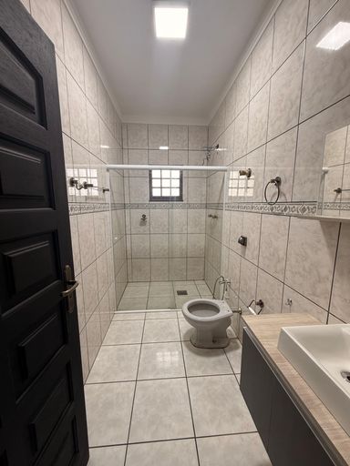 Em um terreno de 300m² e 310m² de construção, a casa possui três dormitórios, uma suíte.